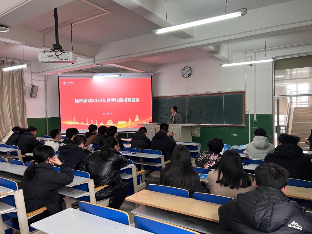 中国移动榆林分公司的工作人员为同学们介绍了企业的相关信息及2024届校园招聘的相关岗位要求,在场同学认真相关招聘信息,积极投递简历。